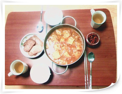 간만에 밥도 하고 찌게(김치+참치+오뎅)도 끓이고 스팸도 굽고 오징어 젓도 올리고..